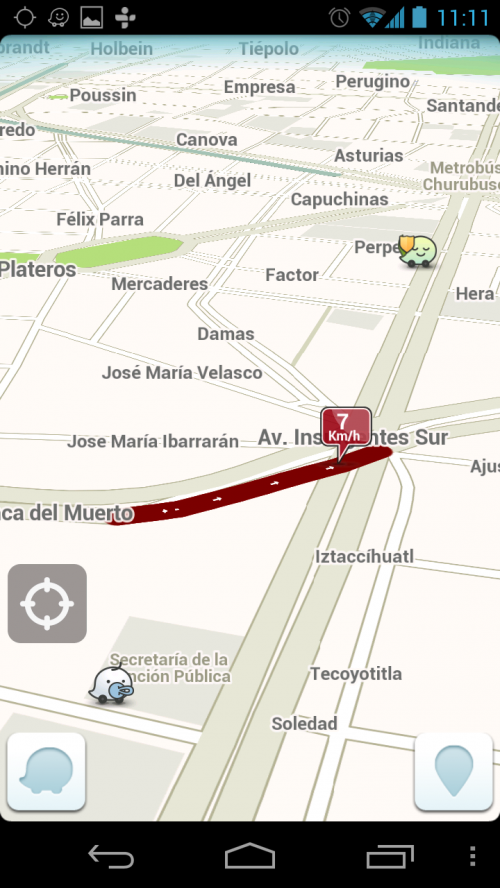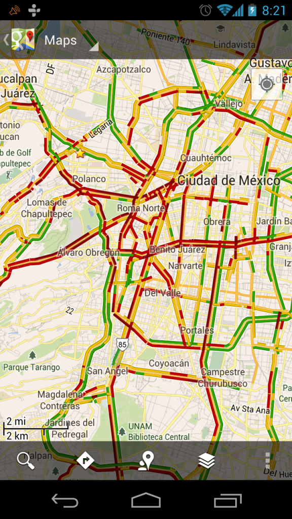 Continuing with the same app category, Google Maps allows a traffic jam mapping feature (available on certain cities), showing avenues on the city with high traffic indicators, marking them in red to be considered to the driver for alternative routes to the destination. All the feed for this signaling is given by internet enabled devices (smartphones and tablets), which in conjunction with their internal GPS, provides location and speed while driving to the Google Maps infrastructure to be processed and showed later on. The Green marking indicates fluid traffic and is an alternative route for driving while commuting.